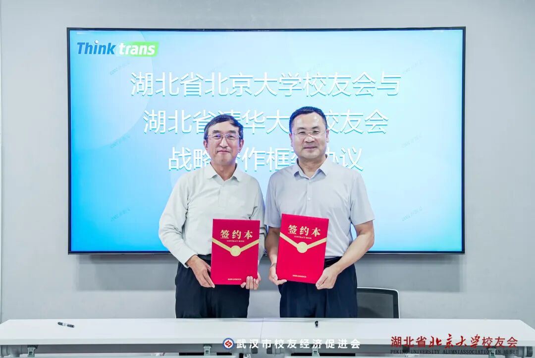 刘萌与赵勇共同签署了湖北省北京大学校友会与湖北省清华大学校友会战略合作框架协议,双方共享校友资源,共办校友会活动,共推校友经济发展。