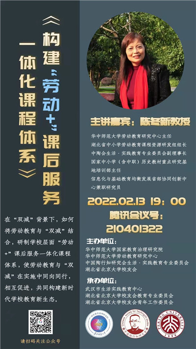 由湖北省北京大学校友会、华中师范大学国家教育治理研究院、华中师范大学劳动教育研究中心、中国陶行知研究会生活•实践教育专委会联合共办的第十五期教育沙龙活动,定于2022年2月13日(周日)19:00在线上举办。