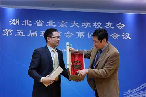 来自全国其他省市区的北大校友会均带来了贺礼,北京大学校友会总会赠送了刻有北京大学的精致摆件;山东省湖北校友会赠送了写有“情系鲁鄂,根植燕园”的卷轴;著名书法家北大校友胡圣虎赠送了“荆楚北大人”和“湖北省北京大学校友会”2件书法作品;安徽北京大学校友会赠送了迎客松锻制铁画;青海北京大学校友会赠送了青稞酒,这些礼物表达了北大总会和各地校友会对湖北省北大校友会的情谊和深深的祝福。