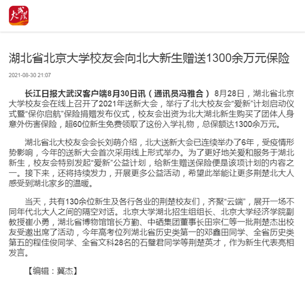 长江日报:湖北省北京大学校友会向北大新生赠送1300余万元保险